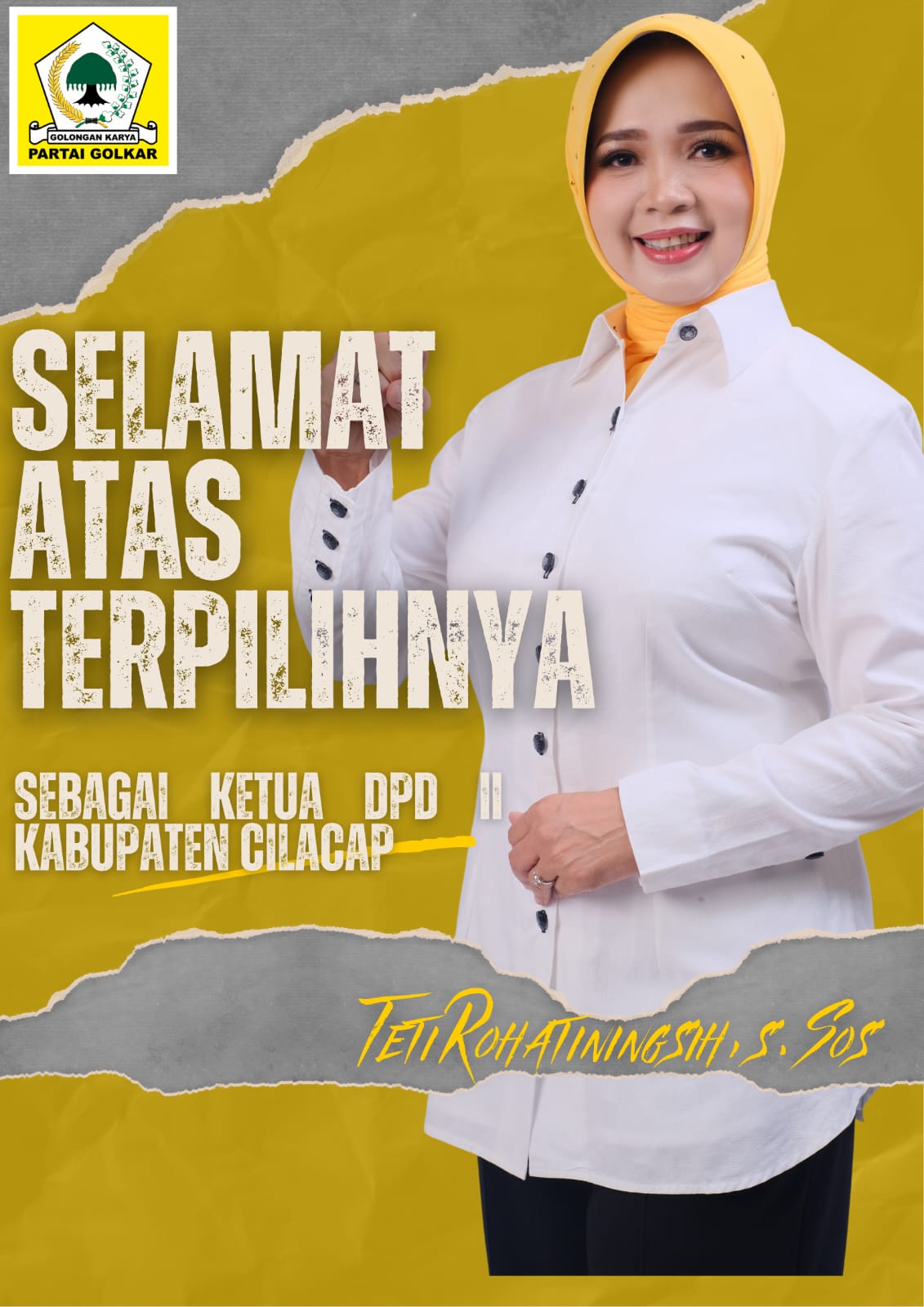 Hj.Teti Rohatiningsih, S.Sos.,terpilih untuk memimpin partai berlambang pohon beringin ini pada periode 2025-2030. Terpilihnya Bunda Teti menjadi angin segar, terutama bagi kaum perempuan di Kabupaten Cilacap yang telah lama merindukan sosok pemimpin perempuan asli Cilacap ini, beliau adalah sosok yang dekat dengan rakyat dan memiliki visi yang jelas untuk kemajuan Cilacap.
